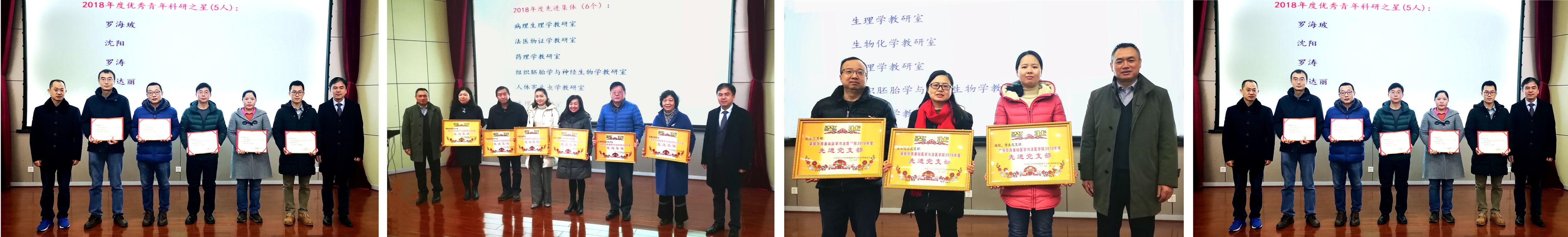 学院教授委员会刘肖珩主席宣布2018年学校和学院先进集体和个人。他表示,2018年在学院党委、行政的领导下,学院在教学、科研、人才培养等各个方面取得了显著成绩,为激励先进、树立榜样、振奋精神,学院评选病理生理学教研室等6个教研室为先进集体,机关党支部等3个党支部为先进党支部,人体解剖学教研室等6个教研室为本科教学先进集体,罗海玻、沈阳、罗涛、陈达丽、王魁五位老师优秀为青年科研之星,董立华、万莉红、袁东智、彭谨、郑焱江五位老师为本科教学先进青年教师,缪世坤、张媛媛、陈琦伟、孙晓东等五位老师为公共事务先进个人。另外,对2018年度beat365官网教职工获学校个人和集体奖励进行了表彰,学院领导对获奖集体和个人一一进行了颁奖。