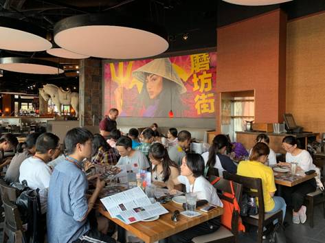 临近当天课程结束,同学们与谢娜老师、Joe老师一起在P.F. Chang’s共进美式中餐,深入探讨中美文化,体会中美饮食与餐桌文化的差异与融合,一片欢声笑语。