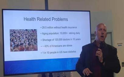 23日上午,同学们怀着兴奋激动的心情,在美方学校Amy老师和助理金思成同学亲切陪同和带领下,来到了亚利桑那州立大学位于城中心的校区。美方Hall教授为项目组的同学们上了一堂生动的Health Enterpreneurship课程,讲授如何从生活中存在的健康相关的小问题出发,设计出合适产品,以及如何确定客户进行销售策划等系列知识。