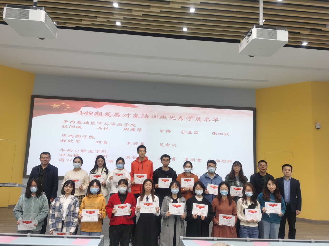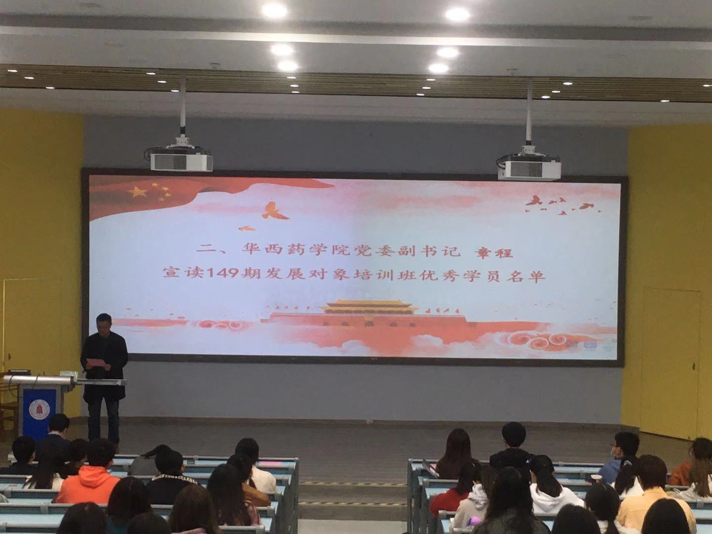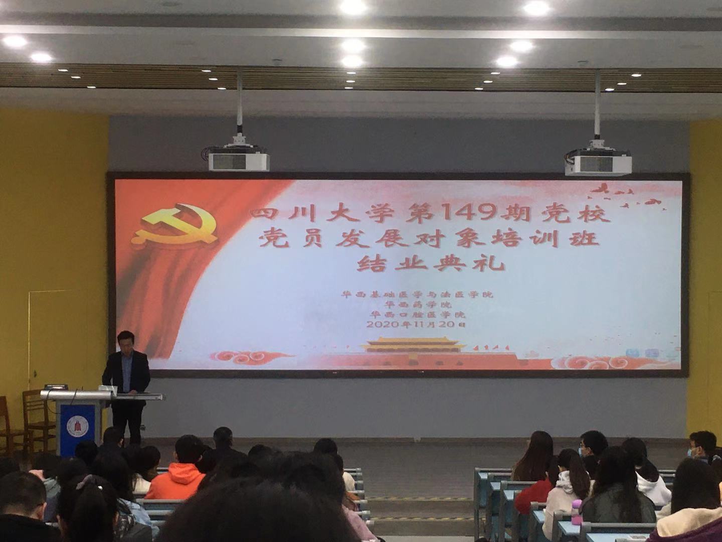 11月20日下午,beat365唯一官方网站、华西药学院、华西口腔医学院联合党校第149期发展对象培训班结业典礼在华西校区九教演播厅举行。beat365唯一官方网站党委副书记郭晓伟、华西药学院党委副书记章程、华西口腔医学院党委副书记孙建勋、发展对象培训班相关工作人员以及第149期发展对象培训班全体学员参加了结业典礼。结业典礼由孙建勋副书记主持。