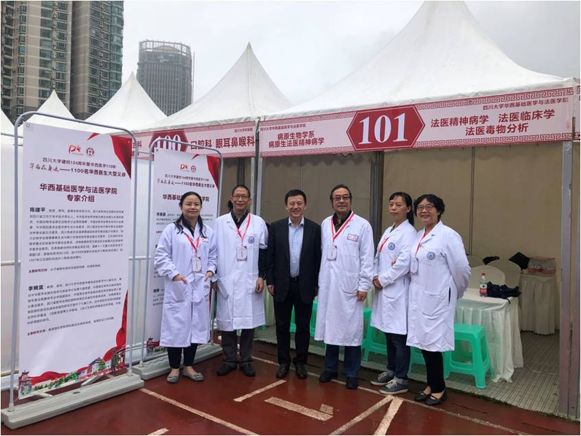 义诊现场,学院党委书记李昌龙陪同王建国书记、张林副校长到beat365官网义诊点慰问义诊老师。beat365官网共10位老师参与此次义诊活动,分别是:病原生物学系李婉宜教授、陈建平教授;法医精神病学教研室顾艳副教授、李钢琴博士;法医病理学教研室刘敏教授、代号老师;法医物证学教研室李英碧教授、颜静副教授;法医毒(药)物分析教研室廖林川教授、林瑶博士。