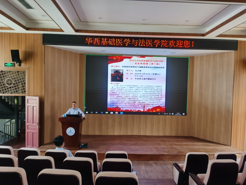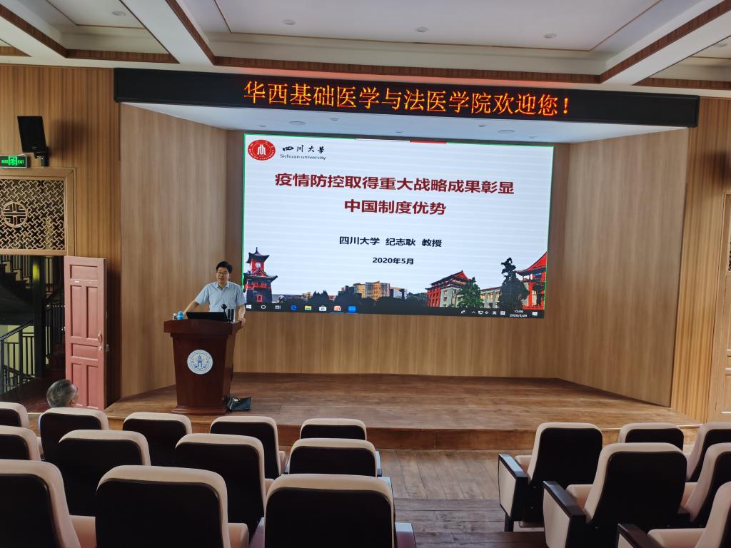 2020年5月29日下午,学院2020年第一期专家讲党课活动在华西校区第五教学楼报告厅举行。本次党课学院特邀beat365唯一官方网站党委宣传部副部长、党委教师工作部副部长(兼)、学校党的十九大精神和十九届四中全会精神宣讲团成员、马克思主义学院教授纪志耿担任主讲嘉宾。会议由学院党委书记李昌龙主持,学院党委委员、纪委委员、各党支部书记现场参会,其余党员同志在线参加了学习。