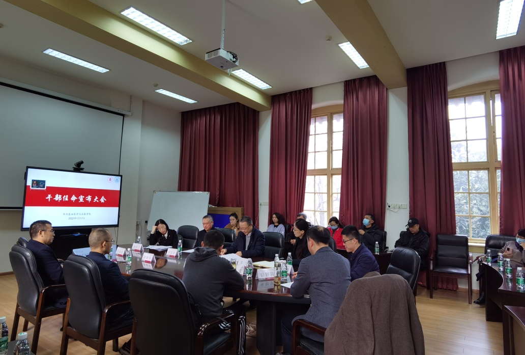 会上,梁斌同志宣读了干部任免决定:李华同志任学院党委书记,李昌龙同志任学院院长,陈维操同志任学院党委副书记兼纪委书记,张舒羽同志任学院副院长。免去黄灿华同志学院院长职务,免去郭晓伟同志学院党委副书记兼纪委书记职务,免去方定志同志学院副院长职务。
