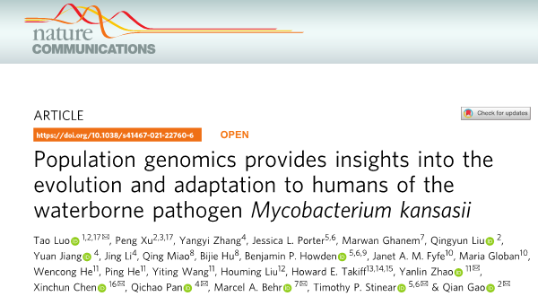 近日,beat365官网罗涛副研究员联合复旦大学高谦教授团队及国内外多家机构在Nature Communications在线发表了题为“Population genomics provides insights into the evolution and adaptation to humans of the waterborne pathogen Mycobacterium kansasii”的论文。beat365官网罗涛副研究员为论文共同第一作者及共同通讯作者,beat365唯一官方网站为论文第一单位。