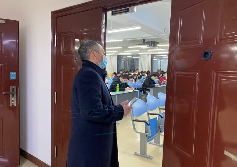 学院书记李昌龙教授深入华西校区课堂,了解课堂疫情防控情况、教师课前准备、教学效果以及学生课堂出勤和新学期精神面貌。在课前与学生交流时,他鼓励学生在疫情防控常态化的情况下,不能放松学习,珍惜学习机会,带着对知识充沛的热情走入新学期。