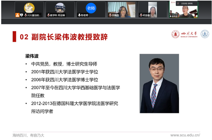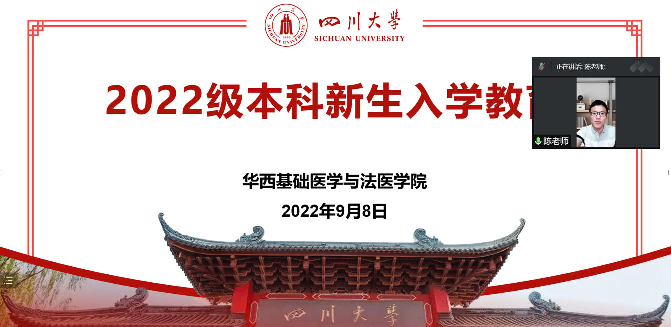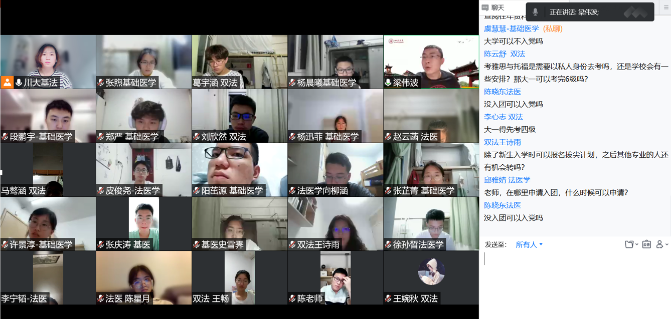 梁伟波副院长做主要讲话。他表示,大学学习、生活与高中完全不同,医科生的学习也与其它学科不同。他分享了自己的学习方法,建议大家要发挥自己学习长处,结合学习内容、学习科目做动态调整。他希望大家能充分利用川大多学科的综合性大学优势,拓展良好的人际关系。他建议同学们努力学习的同时,积极参加各类课外活动,提升综合能力。他强调,大学生是国家的希望、民族的未来,疫情当下,大家更要树立远大的志向,德智体美劳全面发展,成为合格的社会主义建设者和接班人。