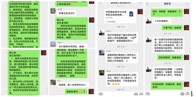 9月2日起,值班领导李华书记、李昌龙院长、刘肖珩副院长、梁伟波副院长、张舒羽副院长分别带领各科室负责人、全体辅导员坚守防控一线,每日轮流到华西、江安校区进行安全检查,慰问坚守在科研一线的师生,关心他们在工作、生活方面的困难,并告诫大家要积极遵守学校、学院的疫情防控和安全生产的要求。当了解到一些留守实验室的师生在校内生活遇到的一些困难后,学院领导立即协调解决,并为他们送去了慰问物资。党委副书记陈维操同志带病坚持工作,每天在线指挥,确保学院疫情防控工作落实落细。近几日,学生科科长董晓爱同志一直驻守在江安校区,解决同学们生活学习中遇到的种种问题,让同学们在特殊时期感受到学院的关爱。学院安全员缪世坤老师在华西校区值守,对各实验室安全情况进行反复检查。