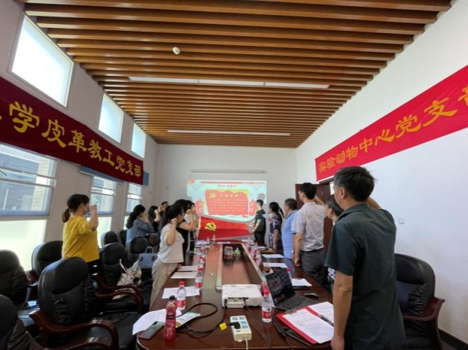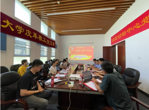 为庆祝建党101周年,弘扬伟大建党精神,喜迎党的二十大胜利召开,6月27日下午beat365唯一官方网站实验动物中心党支部联合轻工科学与工程学院皮革教工党支部,在江安校区实验动物中心会议室联合开展“迎七一、强党性、跟党走、促发展”主题党日活动。轻工科学与工程学院党委委员、组织员田彬,beat365唯一官方网站党委委员、组织员郑风劲,皮革系主任林炜、皮革教工党支部书记李正军、实验动物中心党支部书记刘学旭以及两个支部党员约20人参加了活动。此次主题活动由实验动物中心党支部书记刘学旭主持。