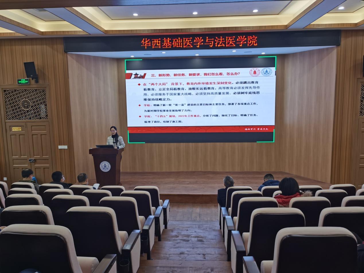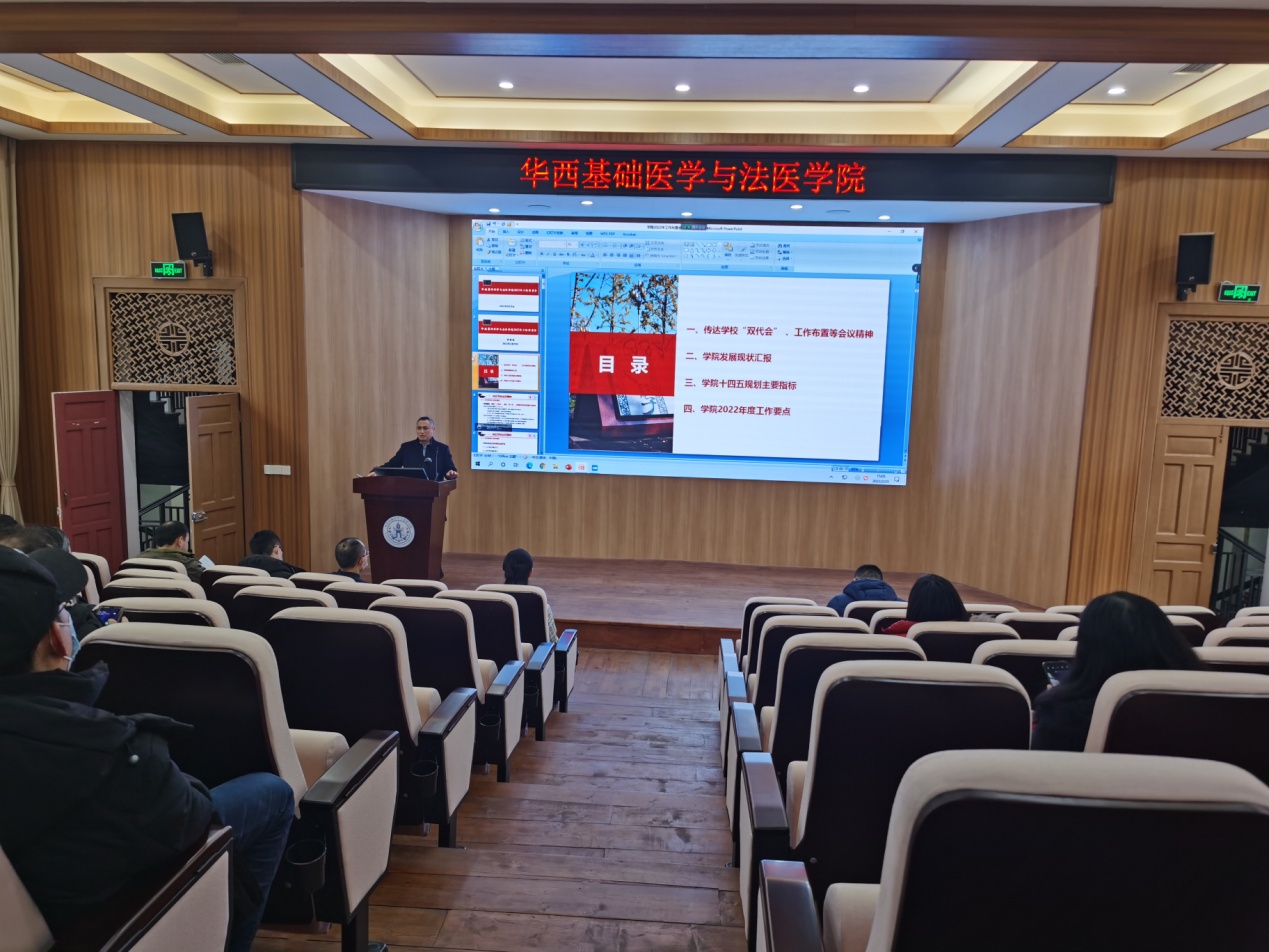 院长李昌龙传达了学校“双代会”暨2022年度工作布置会重要精神,分析了学院现状及存在的问题,解读了学院“十四五”规划的各项任务指标,并布置了2022年度的重点工作。他指出,学院要严格按照要求,抓住基础医学进入第二轮“双一流”学科的机会,紧紧围绕学校和学院“十四五”发展目标,扎实做好人才的“内培外引”。要以强基计划、拔尖2.0计划、双学位培养模式为抓手,持续提升人才培养质量和深造率。要努力推动学科核心竞争力迈上新台阶,提升国际影响力,助力华西医学率先整体迈入世界一流。