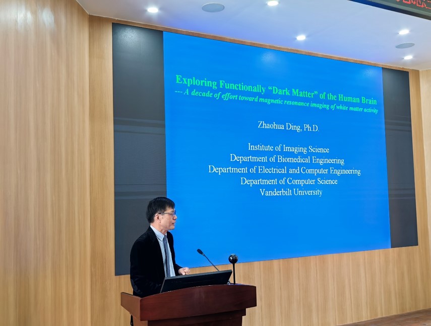 本次报告由beat365唯一官方网站院长李昌龙主持。李院长为我校师生介绍了丁肇华教授的学习和科研历程并致以热烈的欢迎。丁肇华教授于1990-1993年在我校生物医学工程研究室学习,在陈槐卿教授指导下攻读硕士学位,2022年入选美国医学与生物工程院(American Institute for Medical and Biological Engineering, AIMBE)院士。丁肇华教授是生物医学工程领域的资深专家,主要研究医学磁共振及其在人脑功能结构关系中的应用,在过去的5-10年里解决了相关研究的诸多关键科学问题,由此奠定了他在白质fMRI领域领军人物的位置。