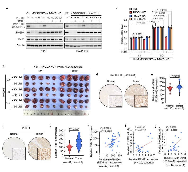 通过在敲除/敲降PHGDH和PRMT1的肝癌细胞中分别回补野生型或突变型PHGDH或PRMT1,研究人员发现PRMT1介导的PHGDH精氨酸甲基化修饰可激活丝氨酸代谢通路,促进GSH和NADPH的生成,从而缓冲细胞内氧化应激压力,在体内外促进肝癌细胞生长。此外,通过对肝癌临床样本进行分析,研究发现PHGDH精氨酸甲基化水平在肝癌组织中上调,且与PRMT1蛋白水平和PHGDH酶活三者之间相互呈正相关,PHGDH精氨酸甲基化水平或PRMT1表达水平高的肝癌患者均具有更差的预后。以上结果表明,PRMT1介导的PHGDH精氨酸甲基化通过激活丝氨酸代谢缓解细胞内氧化应激,促进肝癌生长,可作为肝癌治疗的潜在靶点。