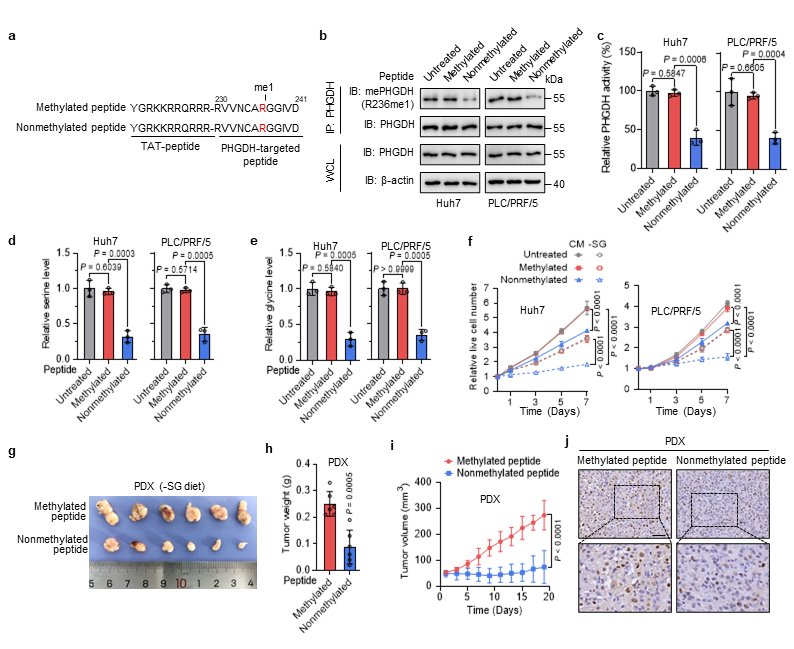研究人员随后合成了PHGDH非甲基化穿膜肽,通过细胞模型、裸鼠肝癌皮下模型和肝癌PDX模型,发现非甲基化肽可竞争性抑制PHGDH精氨酸甲基化,下调PHGDH酶活,抑制丝氨酸合成,促进细胞内ROS积累,在体内外抑制肝癌细胞生长,并且无明显毒副作用。