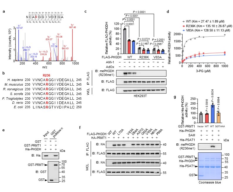 图2. PRMT1介导的R236精氨酸甲基化修饰上调PHGDH酶活