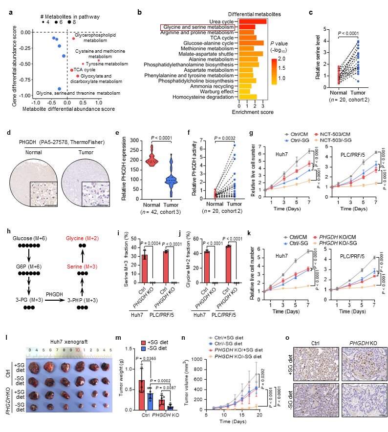 本研究利用代谢组学联合转录组学对同一队列的临床肝癌组织样本进行了分析,通过对差异代谢物和差异基因所富集的代谢通路分别进行差异丰度评分(differential abundance score),发现肝癌代谢组与转录组图谱存在不一致性。其中,肝癌组织中丝氨酸水平上调,而丝氨酸合成第一步反应的限速酶PHGDH的表达却下调。有趣的是,肝癌组织中PHGDH活性却显著高于癌旁组织。在PHGDH低表达的情况下,采用PHGDH小分子抑制剂或CRISPR/Cas9敲除PHGDH仍可抑制肝癌细胞生长,表明PHGDH酶活上调和丝氨酸代谢激活是肝癌细胞生长的重要因素。