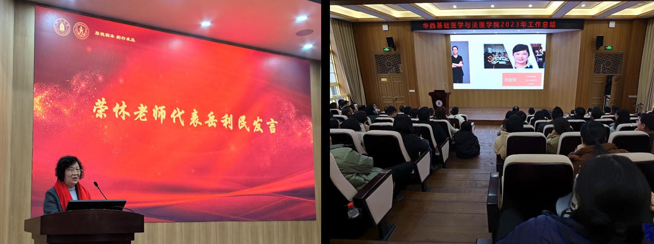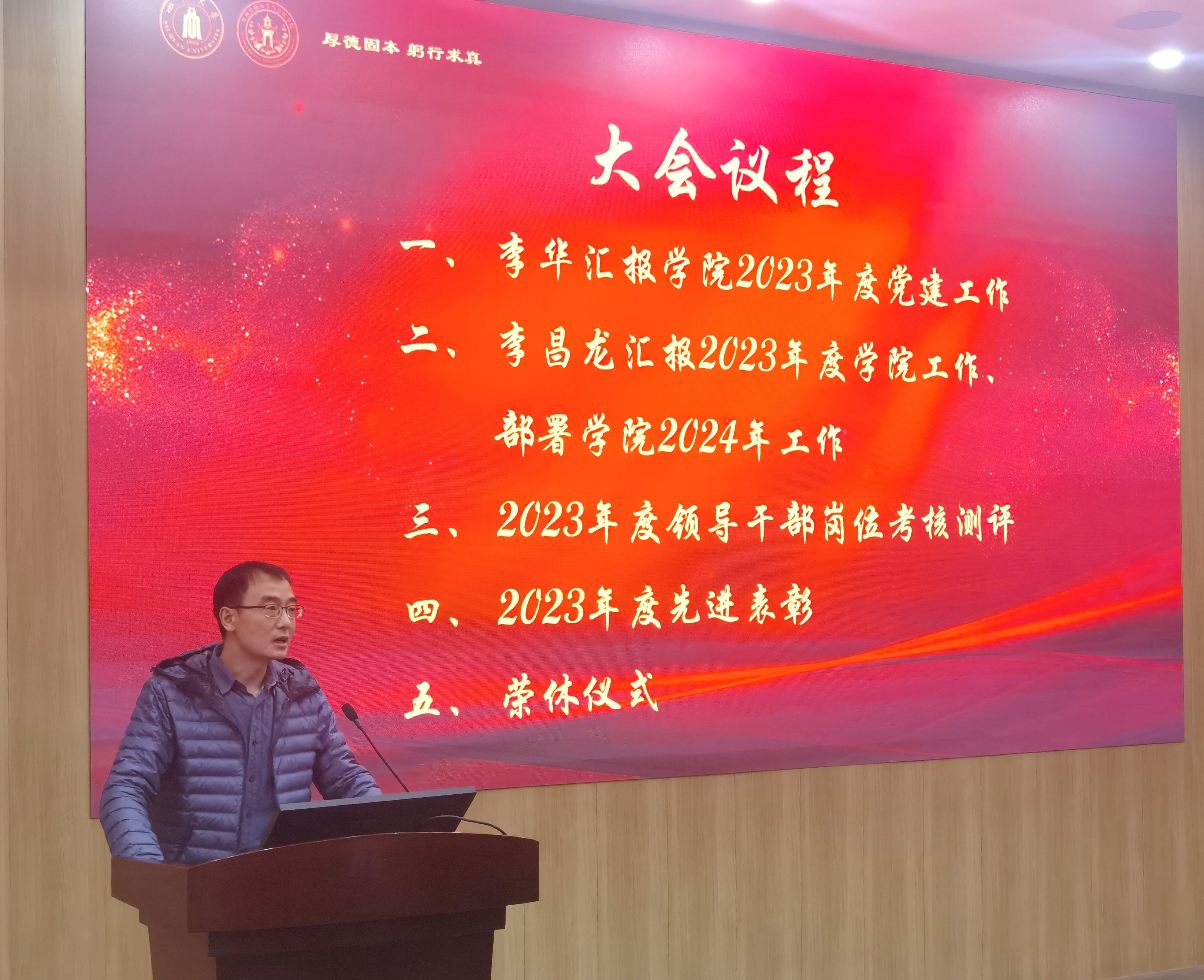 院长李昌龙同志向全院教职工汇报2023年度学院工作,他表示,2023年,学院在领导班子和全体教职工的努力下,在凝练学科方向、建设师资队伍、推进科研工作、提升人才培养质量、开展国际交流合作、筑牢安全环保防线、建设一流保障体系、提升实验动物中心服务水平等方面取得了不错的成绩,他希望在新的一年里,全院教职工要凝心聚力锚定目标,为医学率先整体进入一流贡献华西基法力量。
