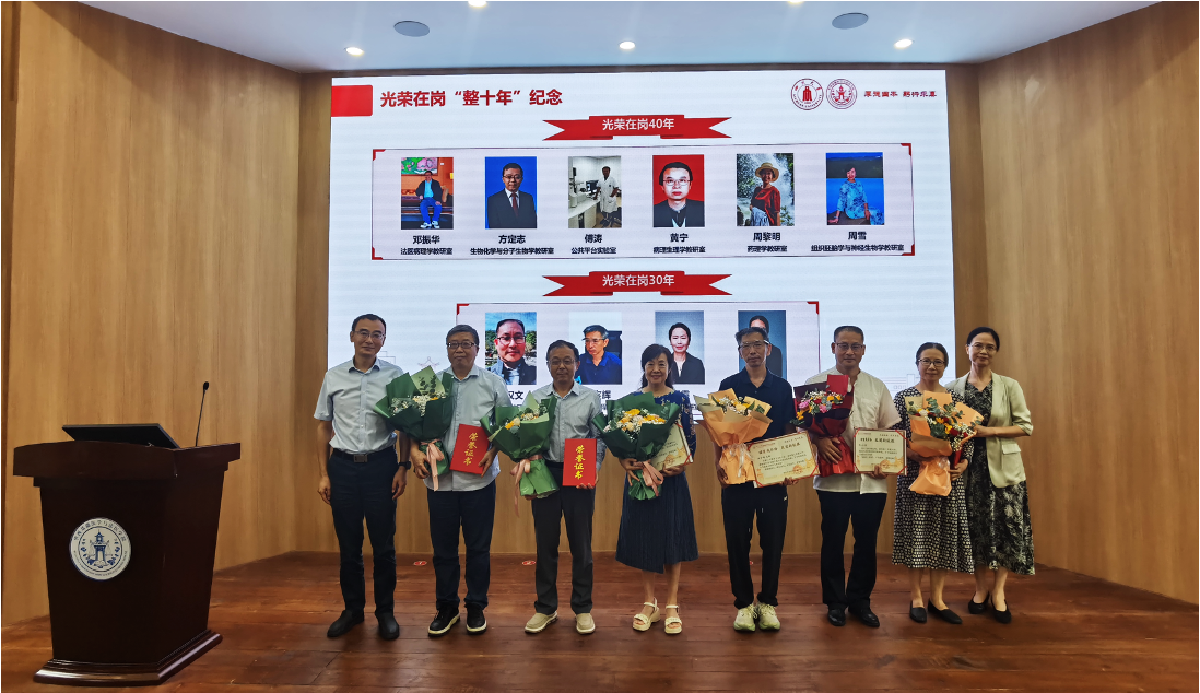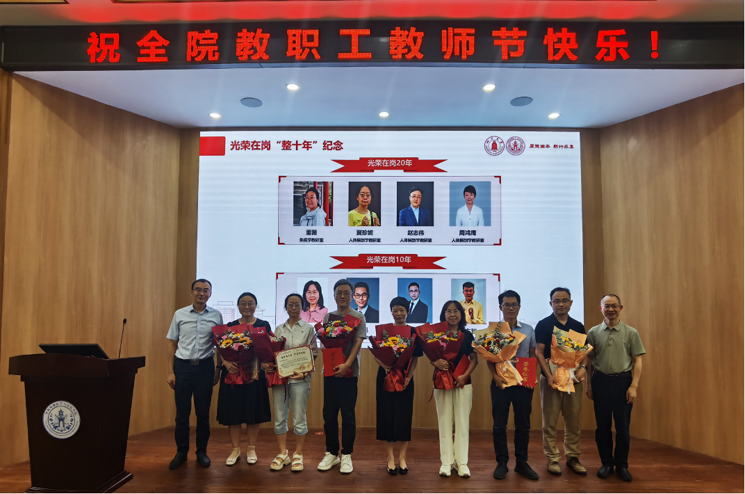 为弘扬先进典型,彰显榜样力量,学院党委书记李华宣布了2025年春季学期以来获得各级表彰的教师和光荣在岗“整十年”教职工名单,对各位获奖教师表示祝贺,希望全院教职工向榜样学习,奋发有为。向各位光荣在岗“整十年”的教职工表示感谢,感谢他们一路以来为学院发展作出的贡献,并为他们颁发纪念证书和鲜花。