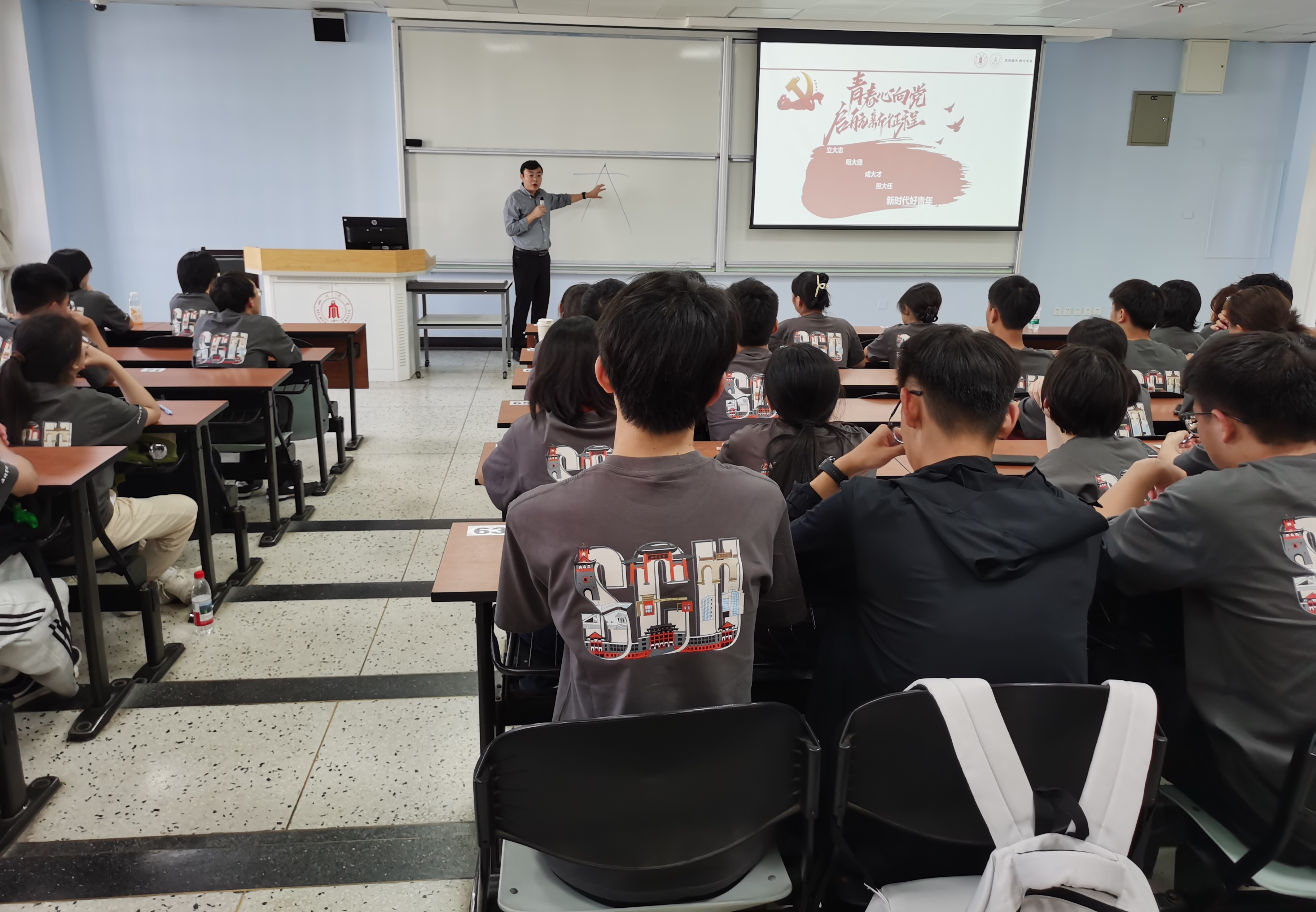 党委书记李华首先代表学院致欢迎辞,祝贺新同学加入学院温暖的大家庭,并以“青春有为,强国有我”为题,为全体新生讲授了一堂思想深刻、内容丰富的“开学第一课”。