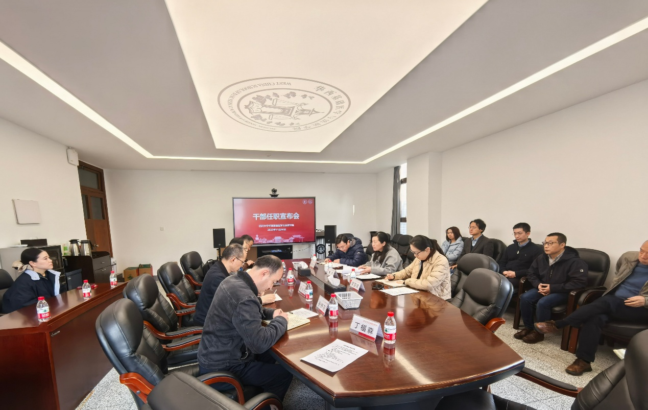 11月28日,学院在华西校区逸夫楼229会议室召开干部任职宣布会。校党委副书记黄园,党委组织部副部长黄雯雯,学院领导班子成员、党委委员、纪委委员、科级干部、教工党支部书记、教研室主任和教职工代表参加会议。会议由院党委书记李华主持。