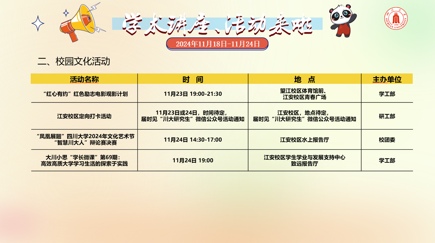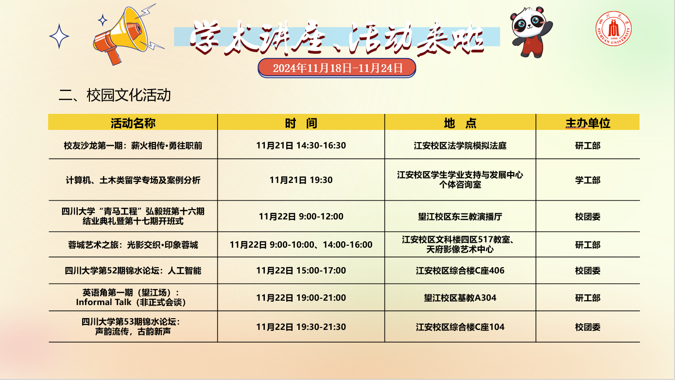 beat365唯一官方网站2024年11月18日-11月24日学术讲座论坛及校园文化活动预告