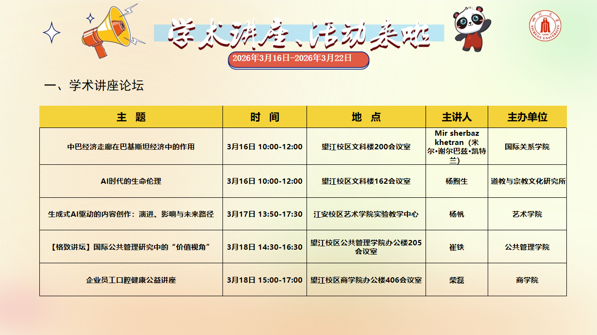 beat365唯一官方网站学术讲座论坛、校园文化活动预告(2026年3月16日-2026年3月22日)