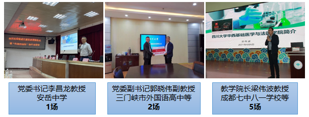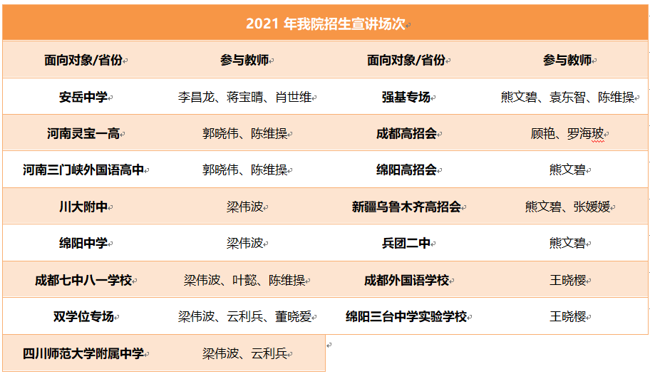 在李昌龙书记的带领下,我们面向安岳中学、成都七中八一学校、川大附中、绵阳中学、成都外国语学校等中学进行宣讲10场,开展名师回母校活动3场,参与成都、绵阳及乌鲁木齐高招会3场,通过专场专题介绍法医与法学双学士双位、基础医学(强基计划)专业情况2场;在高考志愿填报阶段,建立咨询QQ群3个、咨询专机1部,在半个多月的时间内7*24小时不间断回复考生及家长信息。beat365官网师生积极参与校园体验日接待工作4次,累计工作量约为116400人数*分钟。