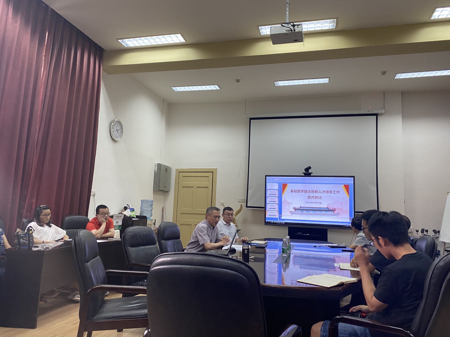 会议现场审阅了拔尖强基计划相关管理文件。最后,李昌龙再次强调了拔尖创新人才培养工作的下一步工作重点,创新培养机制,落实学术导师工作,切实提升人才培养质量。学院各部门、各教研室、各位老师继续定期开展交流,落实教育教学改革,引导学生志存高远、追求卓越,成为真正能服务国家重大战略、勇攀世界科学高峰。终身痴迷科学、潜心基础医学研究和医学基础教育、具有家国情怀、全球竞争力的基础医学拔尖创新人才。