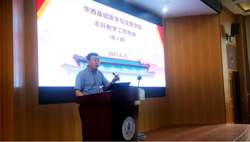 副院长梁伟波教授首先他从教研教改、课程建设、学生培养与毕业、实习基地调研、教学运行与考试以及招生宣传、留学生教学等方面给大家汇报了近期本科教学工作的开展情况。本学期所有课程的良好运行有赖于全院老师的辛勤付出。然后,他布置了后期的工作安排,强调务必在最后的期末考试各个环节做好相关工作。他鼓励大家积极参加、认真准备医学基础教师培优项目——2021年青年教师教学竞赛暨岗位技能大练兵,并且在即将召开的“科学出版社普通高等医学院校‘十四五’基础医学类专家委员会会议暨第一届西部医学基础教育高峰论坛”中,向相关专家学习取经。