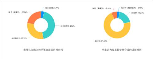 老师们认为,根据教学目标、内容和授课方式调整,线上直播教学时间可短可长。而更多学生则认为按学校时间即45分钟上课时长讲完授课内容比较合适。