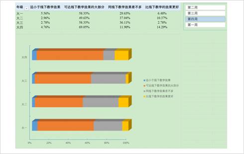 学生对于此次线上教学选用的平台,满意度较高。而且随着老师的不断调整以及学生对于线上教学的不断适应,到第四周,95%以上的学生普遍认为线上教学的效果不会小于线下教学。