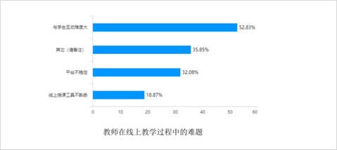 线上教学已过去5周,但老师们仍然在线上授课过程中遇到一些难题,其中线上交互难排第一,还有无法看到学生表情,不好掌握节奏;学生的及时反馈不如线下,课堂讨论和辩论无法开展,部分课程需紧密结合实践教学,在线教学无法弥补……等多种难题。