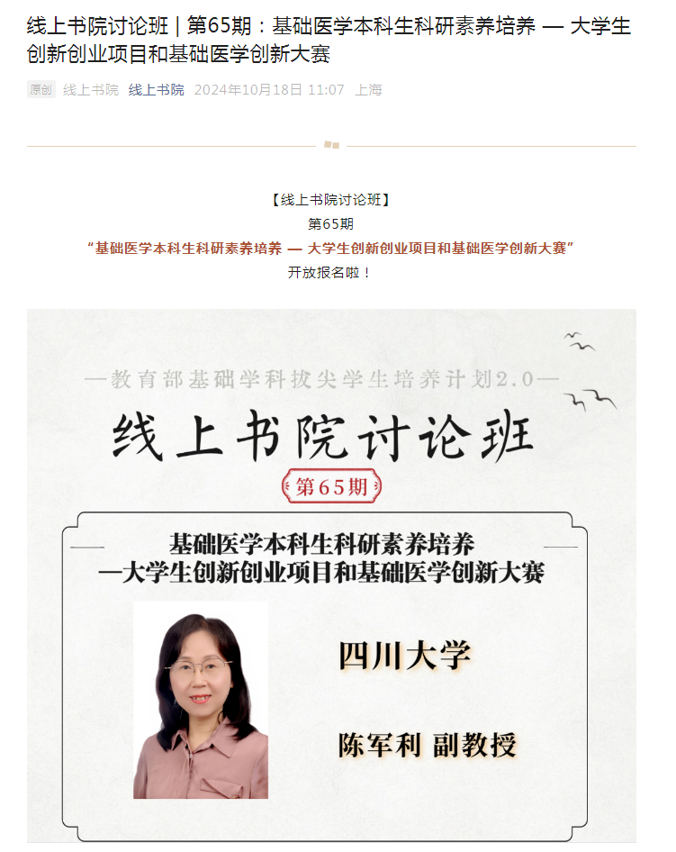 研究团队展由beat365官网姜楠教授团队支持,为全国基础医学拔尖基地师生展示beat365官网导师在本科生指导方面的一些创新做法。线上书院讨论班由陈军利副教授主持,同时面向在线的其他高校学子和我校大一、大二本科生100余人开放,就基础医学本科生科研素养培养展开讨论,从本科生大创项目到全国大学生基础医学创新研究暨实验设计论坛(教育部重点榜单赛事)介绍了如何选择研究方向、如何联系合适的指导老师等。还从基础医学专业培养的角度出发,引导本科生扎实专业基础知识,勇于探索,积极奋进。