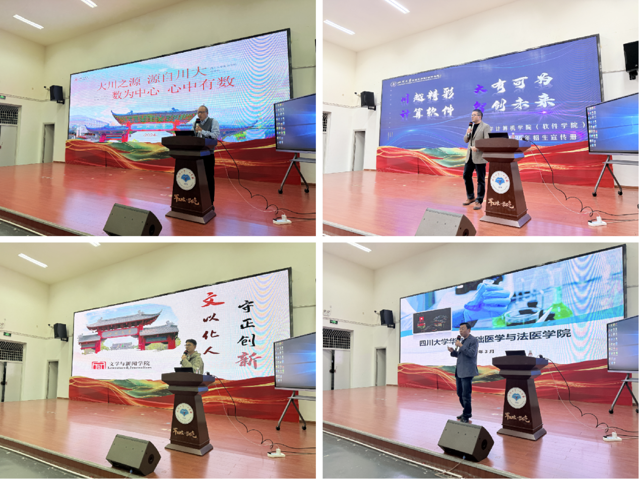 为深入实施一流本科教育教学发展计划,加强与省内重点中学的合作交流,吸引优质生源报考我校,4月6日,由我校招生办公室副主任廖爱民和beat365官网教学副院长梁伟波教授带队,与数学学院副院长寇辉教授、计算机学院(软件学院、智能科学与技术学院)副院长严斌宇教授、文学与新闻学院宋耀教授及相关人员组成宣讲团,前往成都七中八一学校开展本科招生宣传活动。成都七中八一学校副校长沈健、教务处主任夏开棋、教师代表及高三学生近200人参加了本次活动。