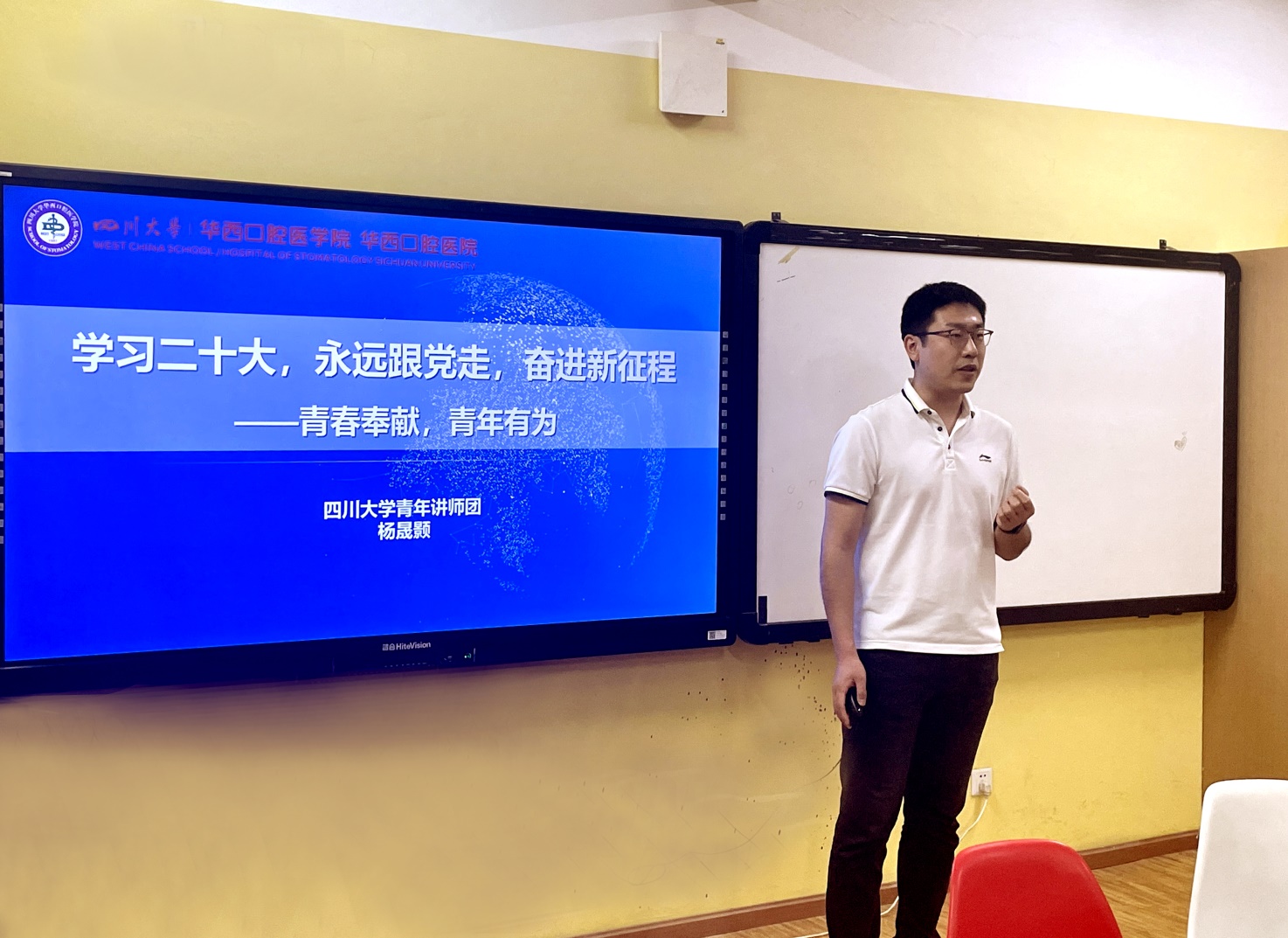 为了继续深入学习党的二十大精神,加强科学理论武装,响应党对新时代好青年的号召, 4月14日下午,beat365官网在江安校区西园4舍一站式活动室举办了“学习二十大、永远跟党走、奋进新征程”的主题宣讲活动,邀请beat365唯一官方网站青年讲师团华西口腔医学院杨晟颢老师主讲,江安党支部及部分学生代表参加了此次活动。