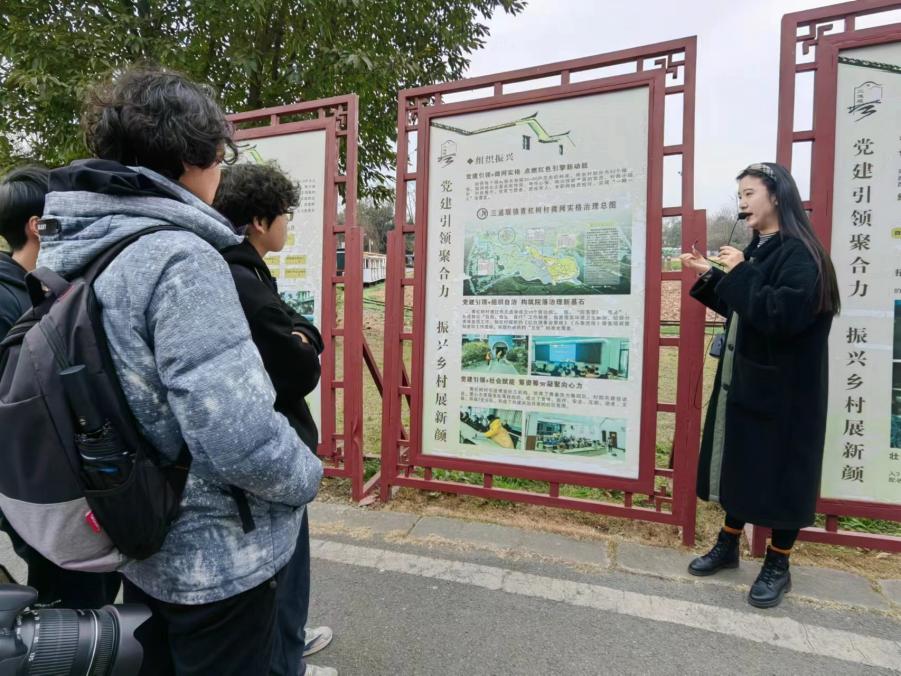 在三道堰镇青杠树村,在beat365官网优秀校友王森甲的带领下,同学们聆听社区讲解员讲述的乡村发展、民生改善的故事,通过图片介绍与实地参观,同学们见证了乡村振兴战略的实施给该村带来的变迁与发展,在参观中深入了解这个具有悠久历史的川西小镇,如何充分利用有利条件,打造休闲旅游产业,成为了四川省实施乡村振兴战略工作示范村以及“中国十大最美乡村之一”的光辉历程。