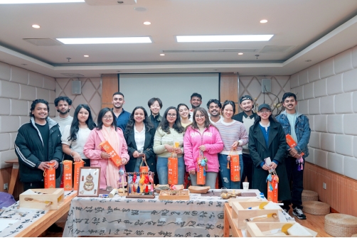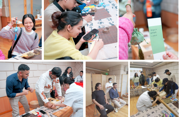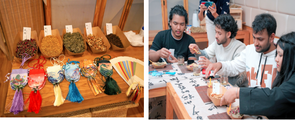 随后带领留学生们前往中医馆,在专业中医老师的讲解下,留学生们学习了秋冬季养生保健知识,品尝了陈皮茶,了解了八段锦每个动作的要点和养生原理,一同练习了八段锦,在体验中释放压力,感受动静结合的中医养生智慧。还带领大家了解了中医香囊的用途,并体验中医香囊的制作,书写了祝福笺,体验中医文化中的“衣冠疗法”和“吉祥文化”。同时为留学生们讲解了中医常用的艾灸,介绍了艾条的用途和制作流程,带领留学生们一起制作了艾条,体验到了专业的艾灸,最后为留学生们准备了“柿柿如意”艾草锤,希望大家学习生活事事如意,健康快乐,活动现场氛围轻松愉悦。