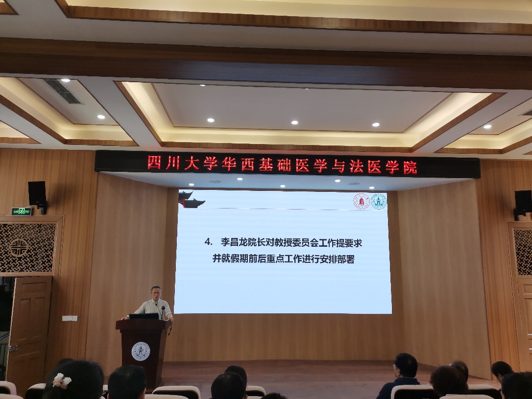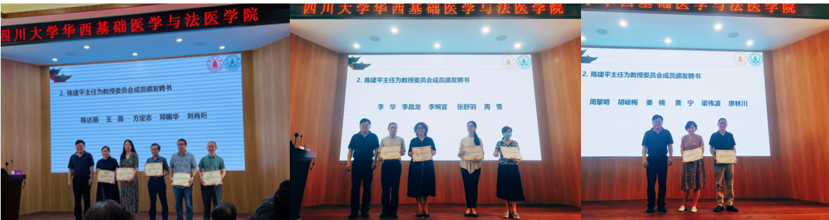 6月24日,全院教职工大会暨新一届教授委员会委员聘任仪式在华西第五教学楼报告厅隆重举行,会议由学院党委书记李华教授主持。李昌龙院长宣读学院新一届教授委员会名单,并为教授委员会主任、副主任委员颁发聘书。19名教授获聘学院新一届教授委员会委员。
