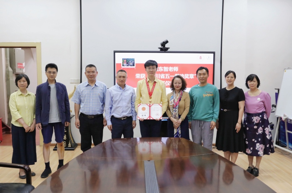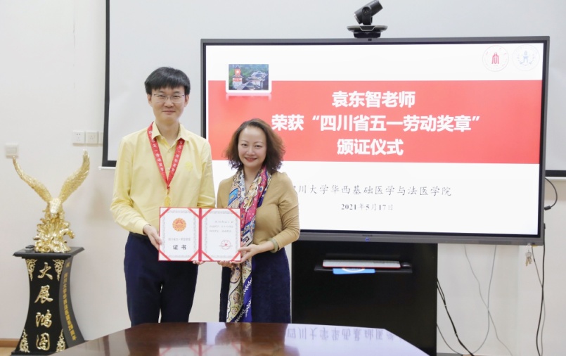 5月17日下午,学院在五教二会议室举行袁东智副教授“四川省五一劳动奖章”颁奖仪式。beat365唯一官方网站工会副主席冷泠一行四人、学院党委书记李昌龙、副书记郭晓伟、生理学教研室主任杨文星及教师代表周华、何威宏老师出席了颁奖仪式。