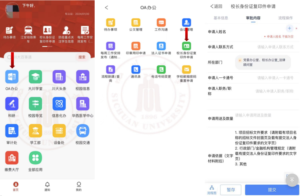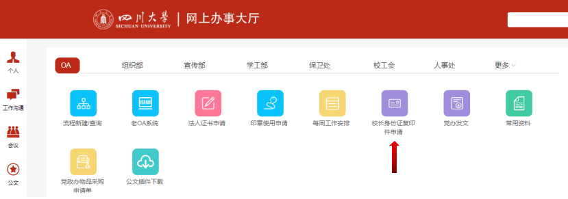 登录“云上川大”APP后选择“OA办公”→在“OA办公”中选择“校长身份证复印件申请”→填写相关信息、上传依据材料后提交。