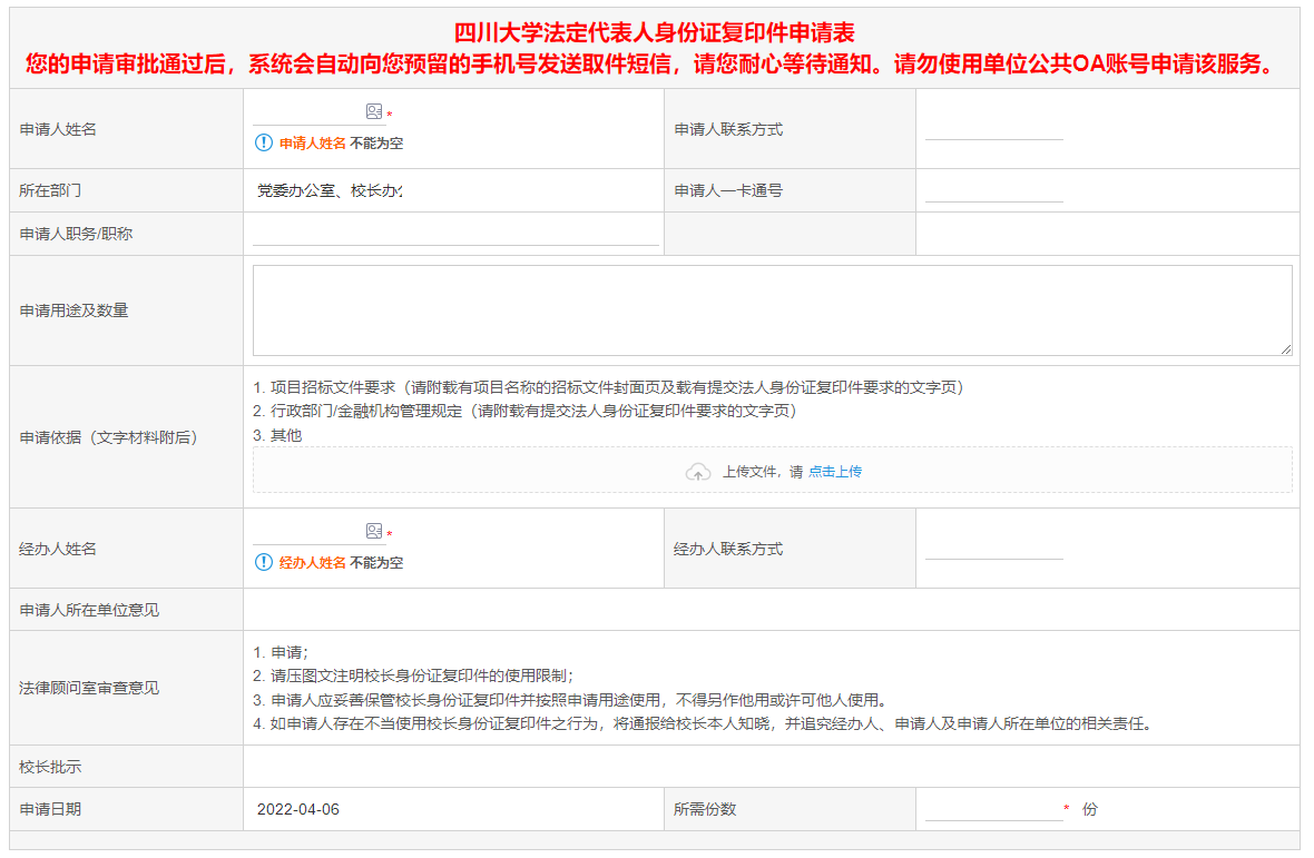 申请人可登录beat365唯一官方网站校园信息门户或“云上川大”APP发起申请流程,经所在二级单位领导审核、法律顾问室审批通过后领取。通知方式为手机短信,请保持手机畅通。