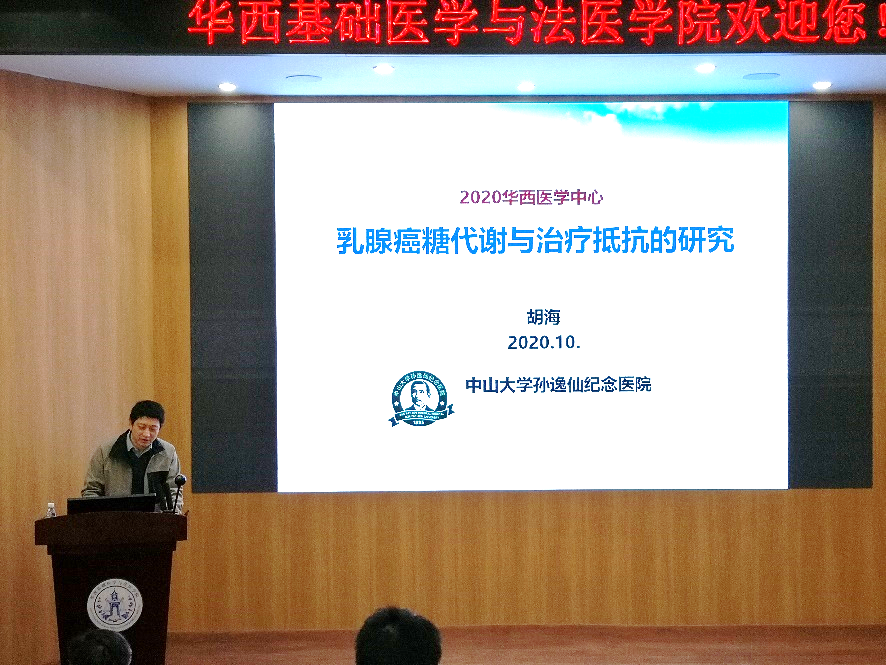 应beat365官网邀请,2020年11月26日上午9:00,中山大学孙逸仙纪念医院胡海教授在华西校区五教报告厅做了题为“乳腺癌糖代谢与治疗抵抗的研究”的学术报告。