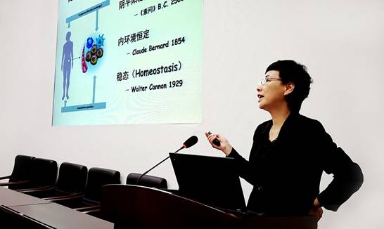 杨晓研究员介绍了其研究团队近些年取得的科研成果,内容包括组织稳态维持过程中不同组织间的协同机制、组织细胞可塑性的调控机制,及其在心脑血管疾病和癌症发生中的作用。她带领课题组在国内率先建立了小鼠条件基因敲除技术体系,系统地研究了TGF-β/Smad信号通路维持组织稳态的生理功能及其机制。杨晓课题组利用体内细胞谱系示踪技术研究肥大型软骨细胞分化为成骨细胞细胞解决了争议了一个世纪的有关肥大型软骨细胞分化的问题。该课题组通过在血管内皮细胞中敲除SMAD4,进而影响周细胞功能,从而解释了脑血管稳态维持的重要机制。此外,该团队发现敲除脑内皮TRG1使MCTx表达显著下降,而大脑海马区乳酸水平升高,乳酸作为一种代谢产物,调控了成体神经的发生,首次揭示脑血管调节脑内乳酸稳态影响成体神经发生和认知的生理功能及其分子机制。师生们纷纷表示,通过聆听杨教授的学术报告会使大家了解了相关领域分子遗传学的发展,并对小鼠条件基因敲除技术在研究人类疾病的病理机制方面的应用有了深入了解。