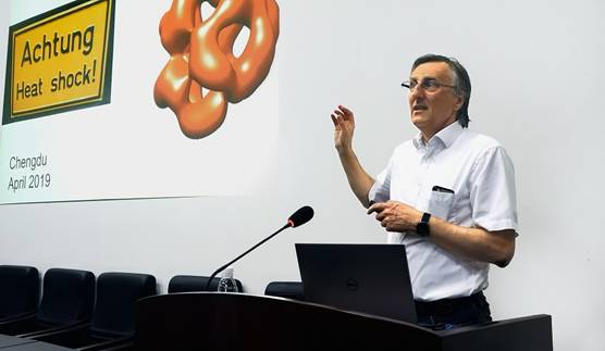 Buchner教授系统地讲述了热激蛋白为主的分子伴侣(molecular chaperones)在生理条件及应激条件下所发挥的重要功能;介绍了细胞内的蛋白质行使功能是处于一种未折叠到折叠的动态变化过程,而热激蛋白家族通过自身构象的变化,在ATP参与下帮助蛋白的折叠和伸展,修复损伤蛋白,从而使机体能够应对外界环境压力。Buchner教授还介绍了其课题组最新的研究进展:Hsp90在癌症发生中发挥重要作用,其主要以二聚体(dimer)形式存在,可以通过松弛到紧密型的剧烈构像变化以及共分子伴侣Bag-1等的参与,稳定P53蛋白,阻止P53被Hsp70-Hsp40失活,并保护其与DNA的结合,从而保持正常的细胞增殖,避免细胞发生癌变。Buchner教授还介绍到一种小热激蛋白α-Crystallin,主要存在于晶状体中,能够阻止蛋白聚集,稳定晶状体内的蛋白稳定。随着年龄增长或者病变条件下,人们的视力会逐渐受损,α-Crystallin在其中发挥了重要功能。Buchner教授还介绍了许多小热激蛋白(sHsp)家族成员需要在压力如温度、PH及磷酸化调控下激活才能发挥功能。Buchner教授在本次报告中介绍的热激蛋白为主的分子伴侣通过促进蛋白折叠调控帮助机体应对压力刺激的分子机制让在场师生深受启发。