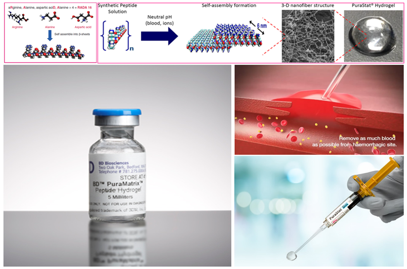 自组装是指构筑基元如有机小分子、大分子、生物分子和纳米颗粒等在非共价作用下自发形成有序结构的现象和过程。2005年美国科学(Science)杂志在在纪念该刊创办125周年之际,提出了包括“我们能推动化学自组装走多远?”在内的二十一世纪25个重大科学问题,受到世界各国科学家的广泛关注和高度重视。自组装短肽(Designer Self-Assembling Peptide)是超分子化学的研究前沿,该领域离子互补性自组装肽的原创科学家为曾工作于美国麻省理工学院(MIT)生物医学工程中心的我校知名校友张曙光博士(美国纽约科学院院士,美国国家发明科学院院士、奥地利科学院院士、美国医学与生物工程院院士),该离子互补性自组装肽(Ion-Complementary Self-Assembling peptide)的原创性发现与广泛生物医学研究在科学界先后获得多项国际大奖,并获2020年度国际蛋白质协会授予Emil Thomas Kaiser Award荣誉(日本北海道举行the World Conference on Protein Science 2020 (WCPS2020)颁发)。近20年来,离子互补性自组装肽水凝胶已获美国多项专利技术,日本3DM公司购买专利权并以专利产品PuraMatrixTM由BD Biosciences与Corning等多家公司代理向全世界销售(图1),其纳米止血专利产品PuraStatâ已经在日本与欧洲获得临床应用批文(https://www.3dmatrix.com/products/purastat/)。