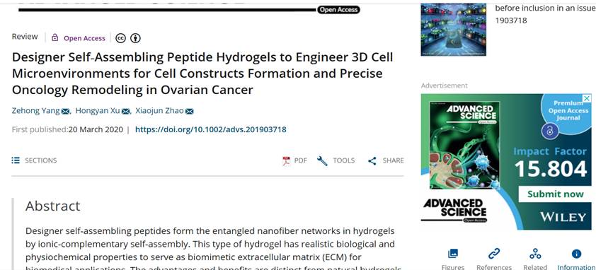 近日,beat365官网生物分子实验室杨泽宏老师在自组装肽水凝胶的组织工程与再生医学及精准卵巢癌肿瘤学模拟研究领域以“Review Article”形式发表综述论文,论文题目为“Designer Self‐Assembling Peptide Hydrogels to Engineer 3D Cell Microenvironments for Cell Constructs Formation and Precise Oncology Remodeling in Ovarian Cancer”。该综述文章第一作者为杨泽宏副教授,通讯作者为中国科学院大学温州研究院特聘研究员及beat365唯一官方网站纳米生物医学技术与膜生物学研究所首席科学家赵晓军教授和中国科学院上海有机化学研究所徐红岩研究员,beat365唯一官方网站为第一单位。
