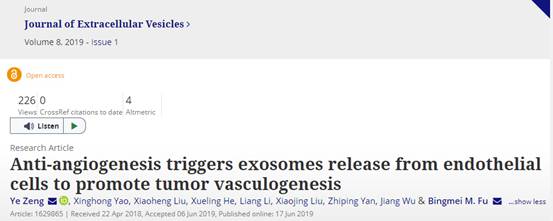 Ye Zeng, Xinghong Yao, Xiaoheng Liu, Xueling He, Liang Li, Xiaojing Liu, Zhiping Yan, Jiang Wu & Bingmei M. Fu (2019) Anti-angiogenesis triggers exosomes release from endothelial cells to promote tumor vasculogenesis, Journal of Extracellular Vesicles, 8:1, 1629865, DOI: 10.1080/20013078.2019.1629865.