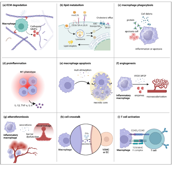 然后,重点介绍了易损斑块中巨噬细胞的关键贡献,包括诱导ECM重塑、泡沫细胞形成、促进斑块内炎症、坏死核心形成、斑块内血管生成、斑块内出血以及与其他细胞类型的相互作用。