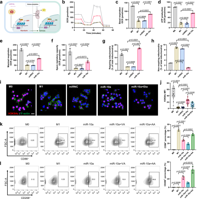 随后,作者分析了炎性巨噬细胞中差异表达miRNA,发现miR-10a-5p在M1表型巨噬细胞中显著下调,且与巨噬细胞线粒体代谢重塑有关。体外研究发现,miR-10a可以恢复M1表型巨噬细胞线粒体能量代谢,并显著增加组蛋白乙酰化水平(H3K9Ac)从而重编程M1表型巨噬细胞为M2表型。