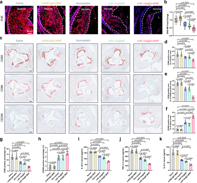 作者进一步评估了miR-10a@H-MNP在体内的治疗效果。结果发现,miR-10a@H-MNP治疗可以显著减少主动脉斑块脂质沉积,减少主动脉根部脂质含量和坏死核心面积,增加胶原含量并提高斑块稳定性。