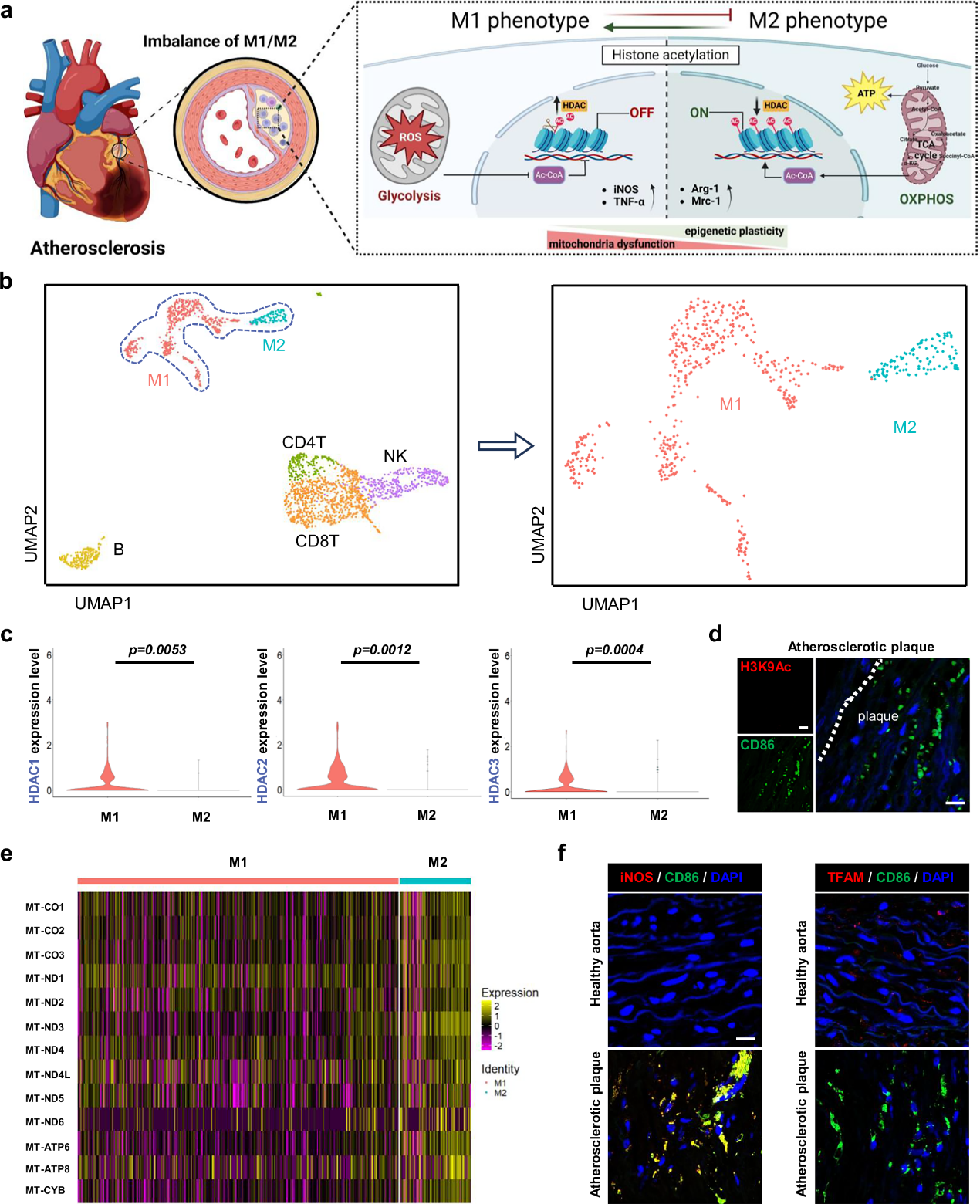 作者通过分析人冠状动脉斑块scRNA测序数据鉴定出6个CD45+簇。进一步研究发现,斑块中M1表型巨噬细胞的数量高于M2表型的数量。此外,M1表型巨噬细胞中组蛋白去乙酰化酶HDAC1、HDAC2和HDAC3的基因表达水平显著更高。临床病理样本检测也证实斑块内炎性巨噬细胞组蛋白乙酰化水平(H3K9Ac) 较低,且线粒体氧化磷酸化代谢相关功能受损。
