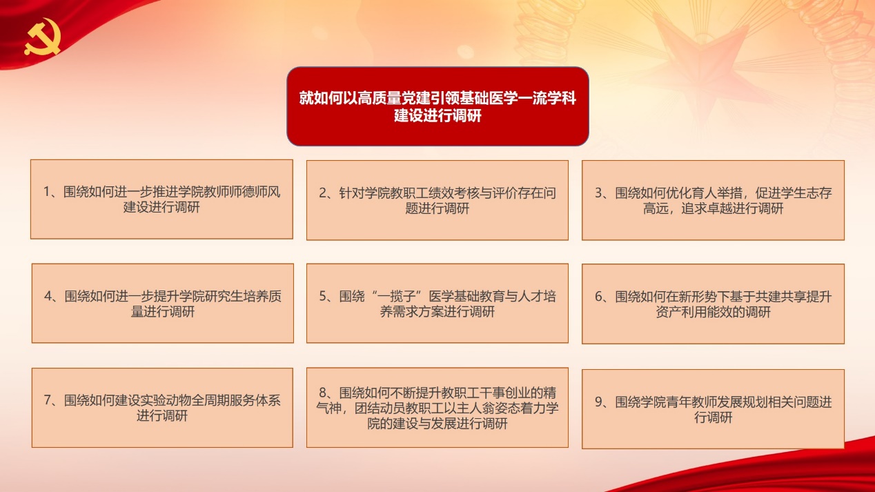 聚焦重点,领题调研。学院领导班子立足学院发展,结合自身工作实际,聚焦学院发展所需、改革所急、基层所盼、师生所想,采取“1+1+N”(领导班子共研1课题、负责领题调研1课题、共同参与调研N课题)的形式,重点调研涉及党建引领学科发展、学生培养等10个问题。领导班子牵头领题,成立调研小组,开展调研工作。